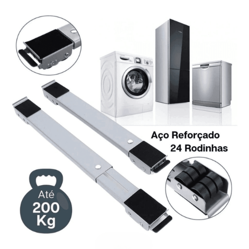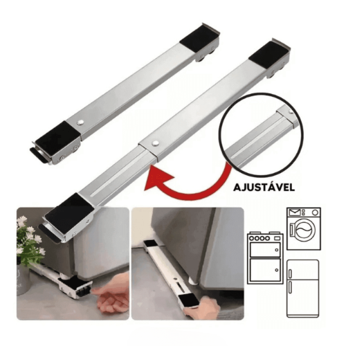 O suporte é ajustável de 46 cm a 71 cm, se adaptando perfeitamente a geladeiras, fogões, máquinas de lavar e móveis pesados.